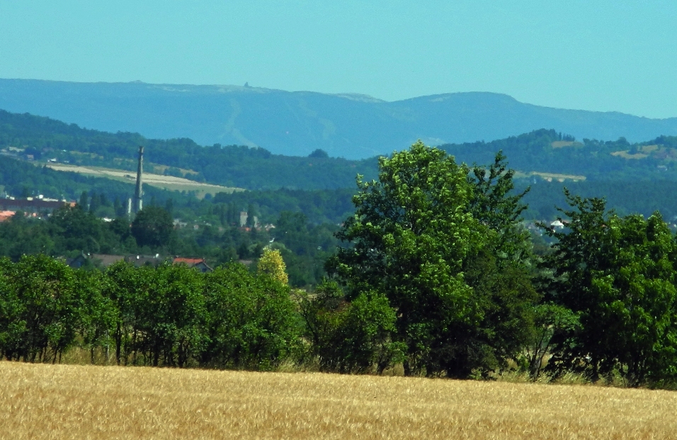 Při pohledu směrem k Turnovu jsou v pozadí Krkonoše, vpravo Kozákov.